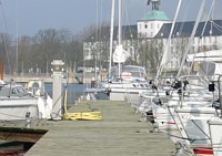 Die Charter-Flotte liegt an der firmeneigenen Steganlage mit Blick auf Schloss Gottorf und den Schleswiger Dom.